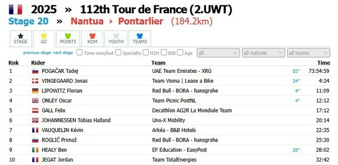 Після 20-го етапу лідером загального заліку залишається Тадей Погачар. Йонас Вінгегор відстає на 4 хвилини і 24 секунди.