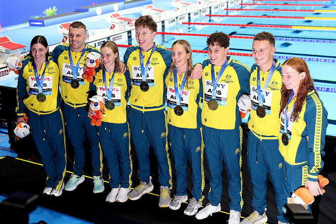 Родзинкою ж недільної програми стали дві кролеві естафети 4х100 м вільним стилем. В обох сценарій був схожим: що в жінок, що в чоловіків представники США лідирували протягом трьох етапів, але поступалися золотом австралійцям на четвертому. Більше того, в чоловічій естафеті збірну США на фініші випередила ще й Італія. Австралійці ж здобули золото, перевершивши на дев’ять сотих секунди рекорд чемпіонатів світу, який тримався з 2019 року і належав американцям. Для фінішера чемпіонів Кайла Чалмерса то вже шосте світове золото в кар’єрі і всі він здобув в естафетах.