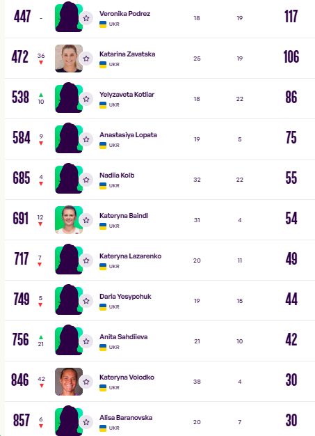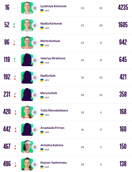 Юлія Стародубцева піднялася на одне місце (73-тя). Прогрес також і у Лесі Цуренко – плюс п'ять позицій (288-ма).