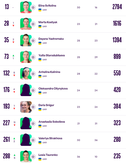 Перша ракетка України Еліна Світоліна зберегла 13-те місце. Марта Костюк втратила одну сходинку (28-ма), Даяна Ястремська опустилася на дві позиції – 35-та.