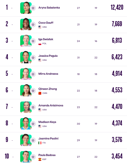 У топ-20 ніяких змін не відбулося. Аріна Соболенко продовжує лідирувати, до першої трійки також входять Коко Гофф і Іга Свьонтек.