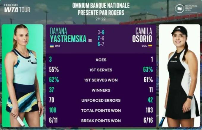 Даяна Ястремська (Україна) [30] – Каміла Осоріо (Колумбія) – 3:6, 7:6 (7:5), 6:2
