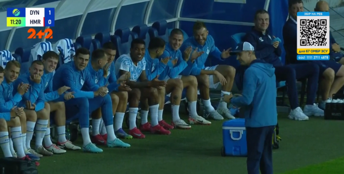 На 12-й хвилині центральний захисник киян Крістіан Біловар забив у ворота мальтійців, що викликало купу емоцій на лаві запасних столичного клубу, де з-поміж інших футболістів виділяється Андрій Ярмоленко. Здебільшого гравці Динамо посміхалися та сміялися з голу, який, у підсумку, скасували через гру рукою.