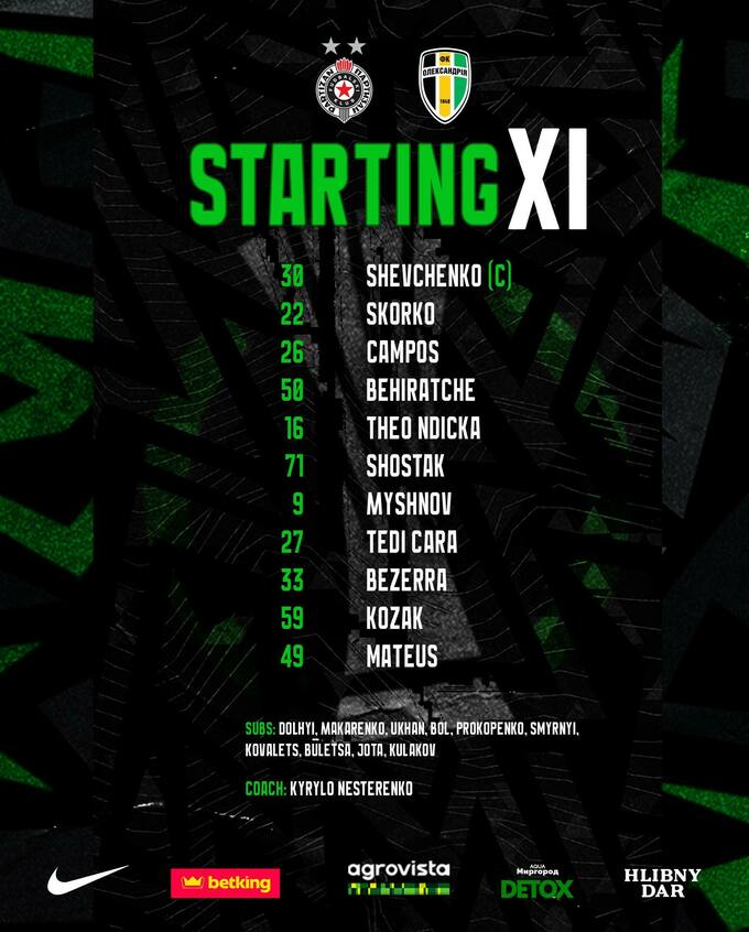 «Олександрія»: Шевченко – Скорко, Кампуш, Беїратче, Тео Ндіка – Шостак (Ухань, 75), Мишньов (Смирний, 56) – Безерра, Козак (Боль, 20), Цара (Жота, 56) – Матеус (Кулаков, 46)