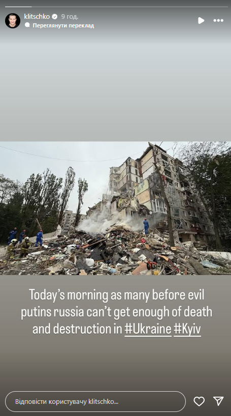 «Сьогоднішній ранок, як і багато разів до цього. Злій путінській росії все ще недостатньо смертей та руйнувань в Україні, в Києві».