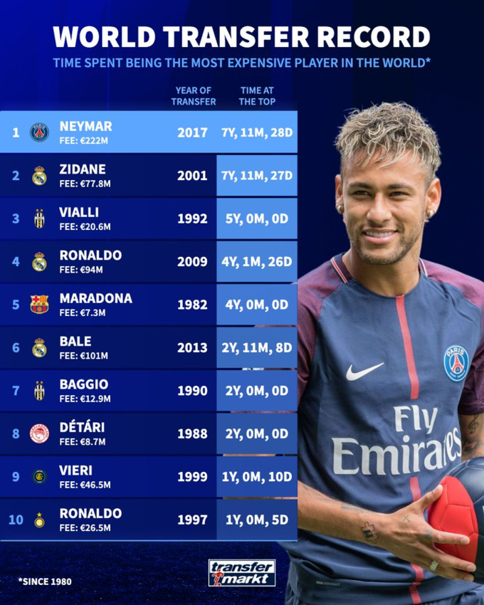 Бразилець обійшов у рейтингу Зінедіна Зідана, трансфер якого був рекордним 7 років, 11 місяців та 27 днів. Неймар тепер має на один день довше.