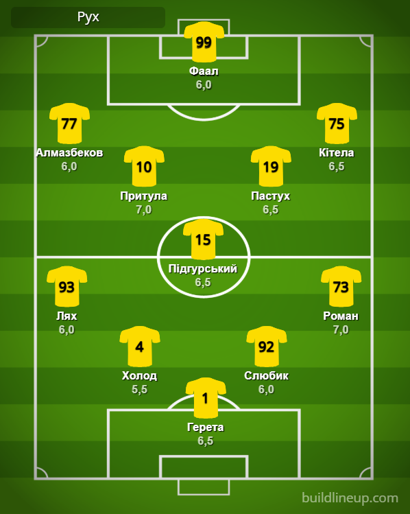 «Рух»: Герета – Лях, Холод, Слюбик, Роман – Притула (Слюсар, 90+3), Підгурський, Пастух – Алмазбеков (Руніч, 75), Фаал, Кітела (Клайвер, 63).