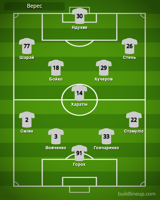 «Верес»: Горох – Сміян, Вовченко (Ціпот, 71), Гончаренко, Стамуліс – Бойко, Харатін, Кучеров (Кльоц, 63) – Шарай (Куція, 64), Ндукве (Воллі, 71), Стень (Годя, 80).
