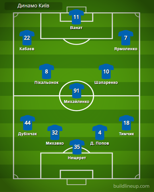 «Динамо» Київ: Нещерет – Дубінчак, Михавко, Д. Попов (Біловар, 60), Тимчик – Піхальонок, Михайленко, Шапаренко (Бражко, 76) – Кабаєв (Волошин, 46), Ванат, Ярмоленко (Пономаренко, 75).