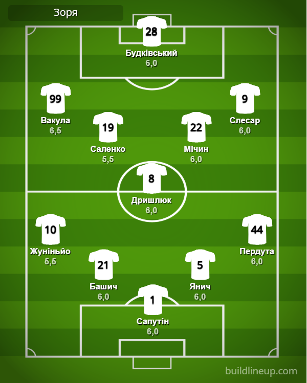 «Зоря»: Сапутін – Жуніньйо, Башич, Янич, Пердута – Саленко (Джордан, 80), Дришлюк (Малиш, 80), Мічин (Руан, 75) – Вакула (Маткевич, 59), Будківський, Слесар.