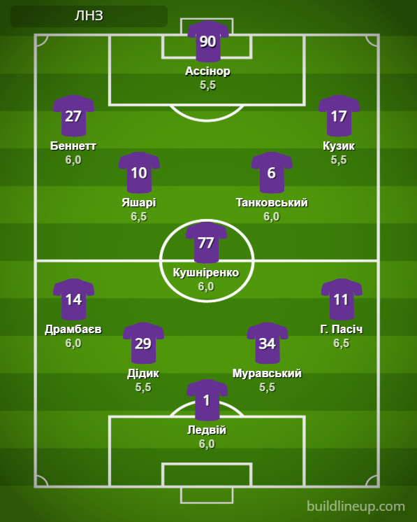 ЛНЗ: Ледвій – Драмбаєв, Дидик, Муравський, Г. Пасіч – Яшарі, Кушніренко (Нонікашвілі, 55), Танковський (Рябов, 55) – Беннетт (Ейнел, 65), Ассінор, Кузик (Проспер, 65).