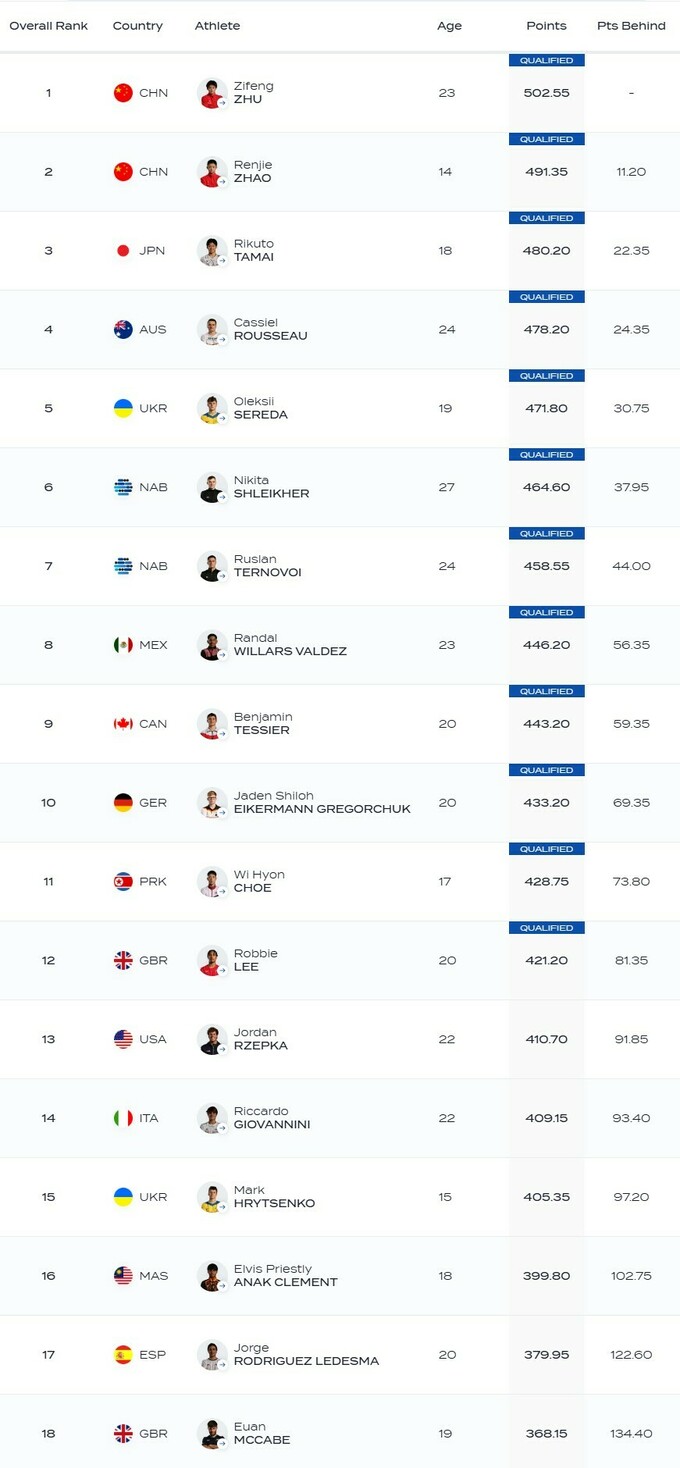 19-річний Олексій Середа показав 5-й результат у півфіналі стрибків з 10-метрової вишки та вийшов до фіналу (топ-12).
