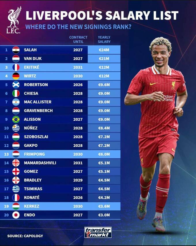 Лідером списку досі залишається єгиптянин Мохамед Салах, який заробляє 24 млн на рік. Одразу за ним йде нідерландський захисник Вірджил ван Дейк з 21 млн.