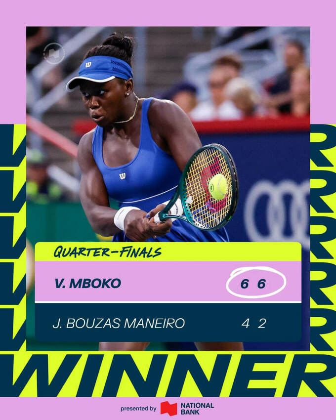 18-річна канадка Вікторія Мбоко в двох сетах впевнено розібралася з Джессікою Бузас Манейро з Іспанії. Мбоко в попередньому колі в статусі андердога здолала Коко Гауфф.