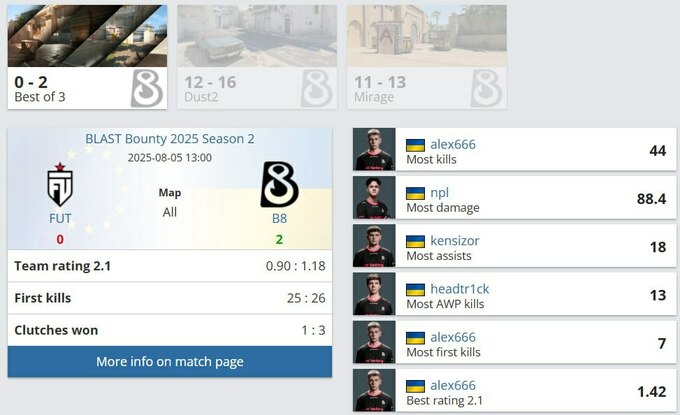 Український склад B8 успішно стартував у закритій кваліфікації BLAST Bounty Season 2 з CS2, здолавши колишню молодіжку NAVI, команду FUT з рахунком 2:0. Матч пройшов на картах Dust2 (16:12) та Mirage (13:11), де B8 зуміли показати характер у вирішальні моменти.