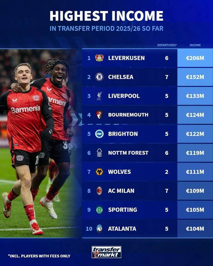 За період літнього трансферного вікна 2025 року лідером за доходами від продажу гравців є леверкузенський «Баєр», який заробив 206 мільйонів євро на трансферах шістьох футболістів.