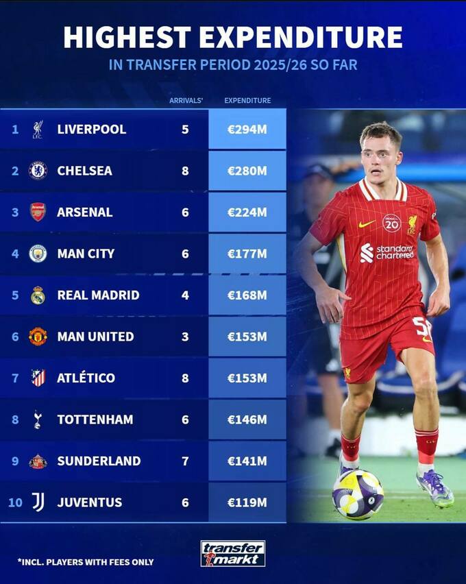 На самій вершині розташувався «Ліверпуль», який на п'ятьох гравців витратив 294 млн євро.