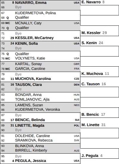 З першого раунду в Цинциннаті повинні стартувати Вікторія Мбоко і Наомі Осака, які зараз перебувають в Монреалі і в ніч на 7 серпня проведуть півфінальні матчі. На старті Цинциннаті вони зіграють або з кваліфаєром, або з лакі-лузером. Але якщо Мбоко і Осака вийдуть у фінал Монреаля, то отримають пропуск першого кола.