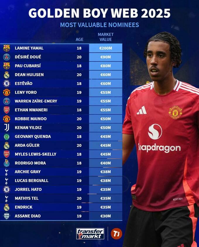 До п'ятірки лідерів також увійшли: іспанський захисник мадридського «Реала» Дін Хейсен (20 років, 60 млн) та бразильський нападник «Челсі» Естевао (18 років, 60 млн).