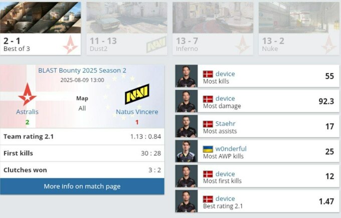 Сьогодні, 9 серпня, у п’ятому ігровому дні BLAST Bounty Season 2 команда Natus Vincere поступилася Astralis з рахунком 1:2 ( Dust 2 – 11:13, Inferno – 13:7, Nuke – 2:13.) та завершила свій виступ на турнірі.