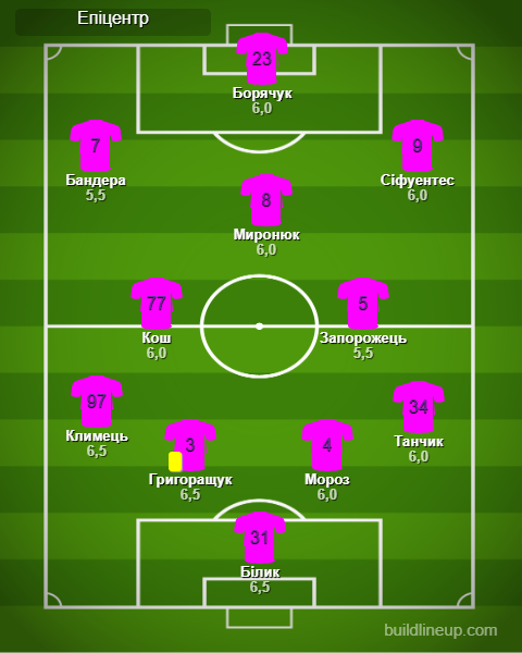 «Епіцентр»: Білик – Климець, Григоращук, Мороз (Сидун, 81), Танчик – Кош, Запорожець (Демченко, 81) – Бендера (Беженар, 46), Сіфуентес (Янаков, 71), Миронюк – Борячук (В. Кристин, 90+1)