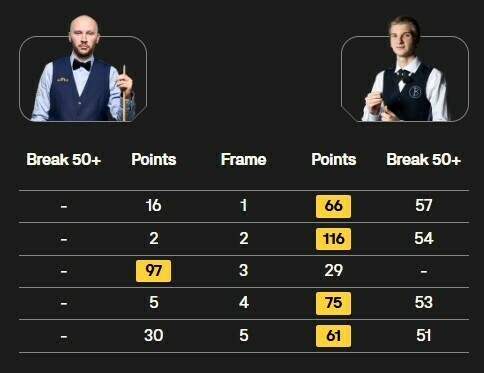 Бойко впродовж матчу зробив 5 півсотенних серій: 57, 54, 54, 53 і 51 очко.