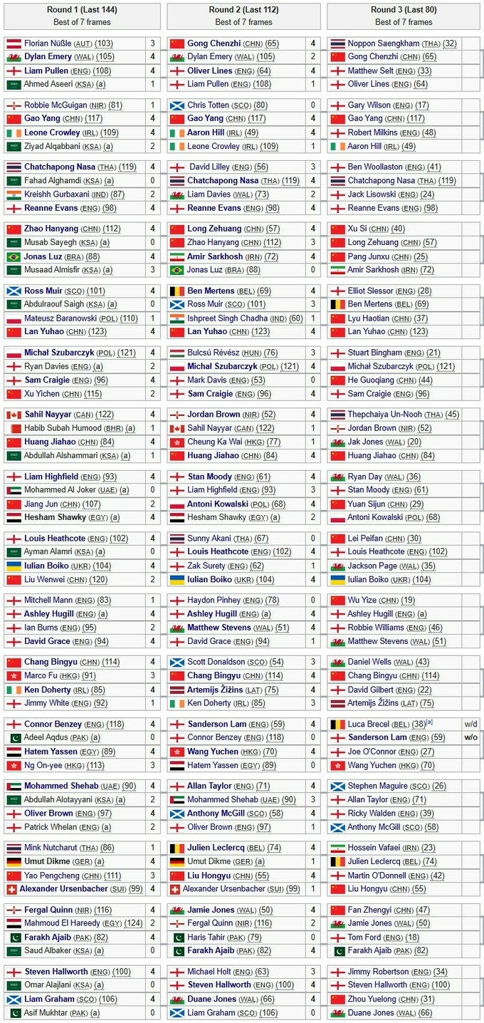 Найкращі 16 снукеристів світового рейтингу отримали прямі путівки в 1/16 фіналу.