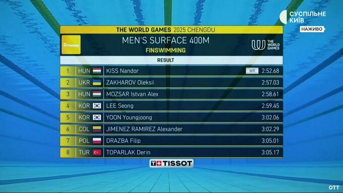 Українська плавець Олексій Захаров завоював срібну нагороду Всесвітніх іграх в моноласті на дистанції 400 метрів.