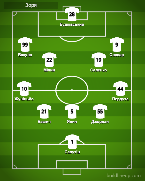 «Зоря»: Сапутін – Жуніньйо (Малиш, 76), Башич, Янич, Джордан, Пердута – Вакула (Горбач, 76), Саленко, Мічин (Руан, 76), Слесар – Будківський.