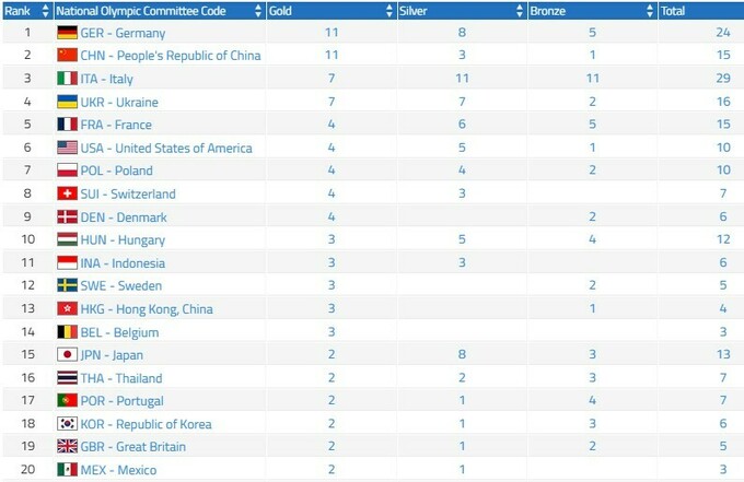 Тепер у збірної України 16 медалей (7 золотих, 7 срібних, 2 бронзових), синьо-жовта команда посідає 4-те місце у медальному заліку.