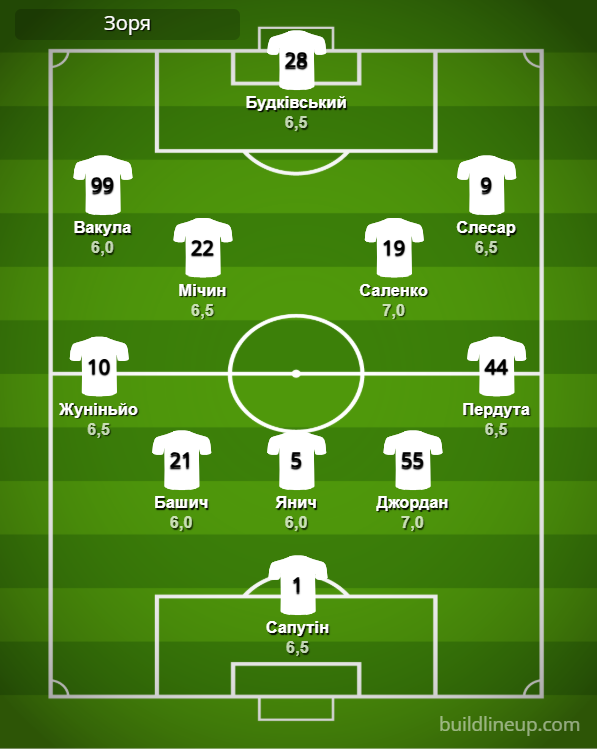 «Зоря»: Сапутін – Жуніньйо (Малиш, 76), Башич, Янич, Джордан, Пердута – Вакула (Горбач, 76), Саленко, Мічин (Руан, 76), Слесар – Будківський.