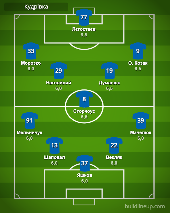 «Кудрівка»: Яшков – Мельничук, Шаповал, Векляк, Мачелюк – Нагнойний, Сторчоус (Світюха, 66), Думанюк (Лосенко, 46) – Морозко (Тотовицький, 66), Лєгостаєв (Безбородько, 77), О. Козак (Коркішко, 82).