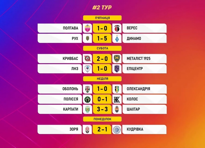 З 8 до 11 серпня відбулися матчі 2-го туру Української Прем’єр-ліги 2025/26.