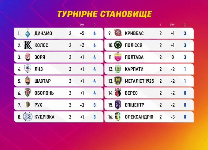 Турнірна таблиця УПЛ після 2-го туру. Динамо та Колос – на вершині