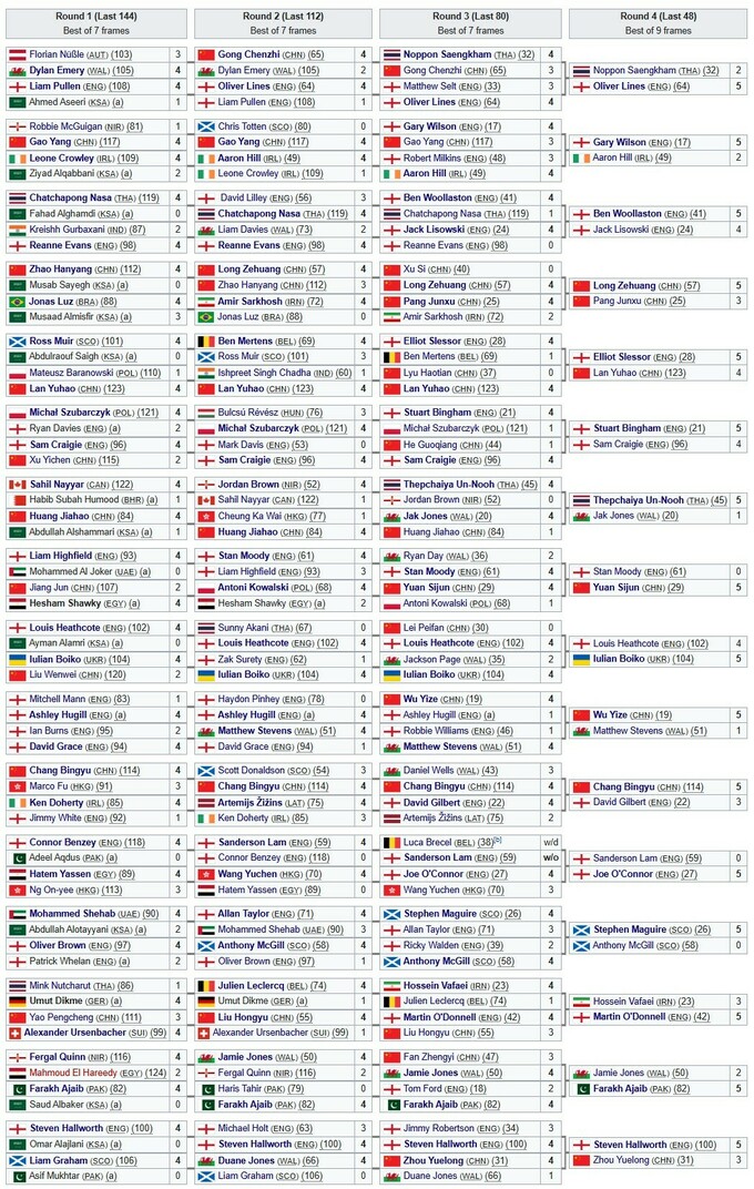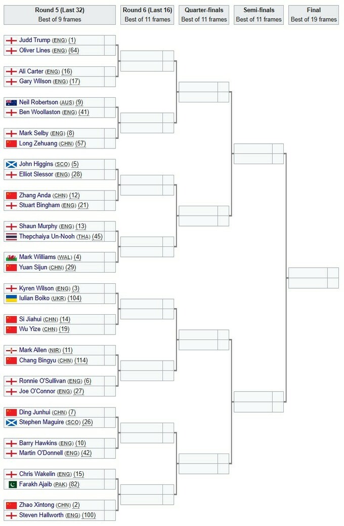 Найкращі 16 снукеристів світового рейтингу отримали прямі путівки до 1/16 фіналу.