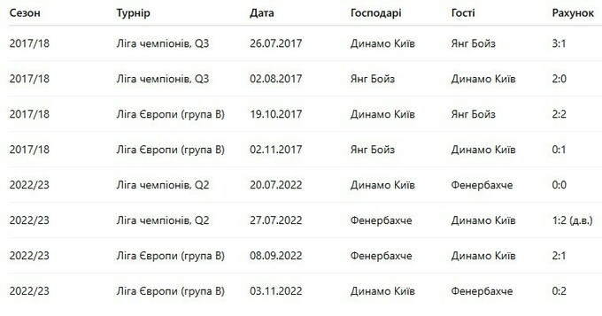 Крім того, у сезоні 2022/23 Динамо двічі зіграло проти турецького Фенербахче. Спочатку була зафіксована перемога за сумою двох матчів у Q2 ЛЧ (0:0, 2:1 д.в.), а потім були невдалі поєдинки в груповому раунді Ліги Європи (0:2, 1:2).