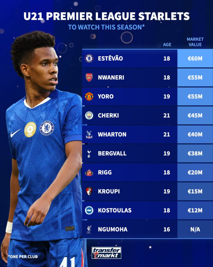 Transfermarkt опублікував список головних зірок АПЛ до 22 років, за якими портал радить стежити (по одному гравцю з кожного клубу). Лідером за вартістю став 18-річний бразильський новачок «Челсі» Естевао, чия ціна нині становить 60 мільйонів євро.