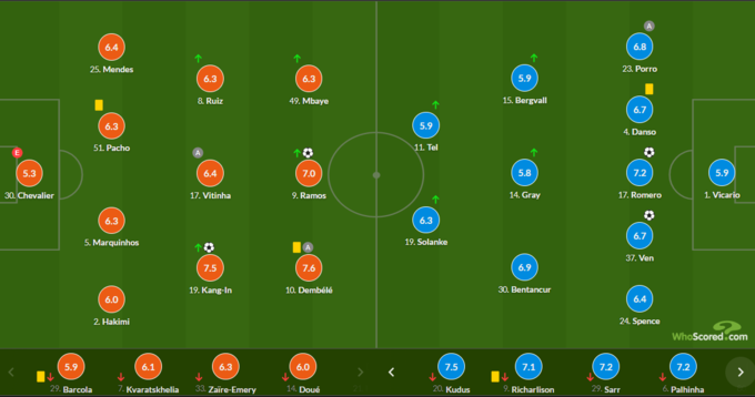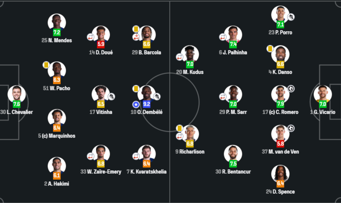 За версією порталів, найкращим гравцем цього матчу став зірковий французький вінгер Усман Дембеле, який відзначився асистом у зустрічі – 9.2 та 7.6 відповідно.