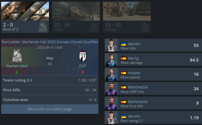 Команда FUT Esports з двома українцями Дмитром «dem0n» Мірошниченком і Микитою «cmtry» Самольотовим програла іспанцям Iberian Soul на кваліфікації StarLadder StarSeries Fall 2025 з CS2. Кінцевий рахунок у матчі 0:2.