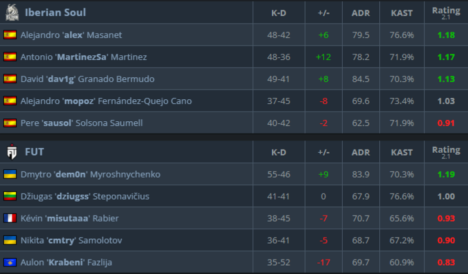 На Mirage також була конкурентна гра, знову FUT Esports добре відіграли в першій половині, за атаку вдалося забрати 8 раундів і за захист вже почалися проблеми. За підсумком, Iberian Soul виграли 13:10 і 2:0 в серії.