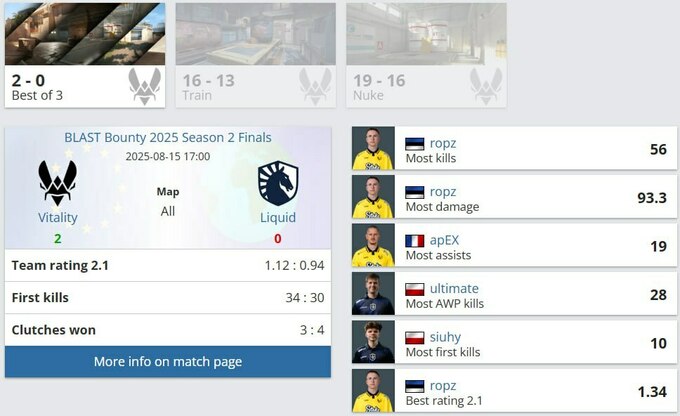 Сьогодні завершилися перші чвертьфінальні матчі BLAST Bounty Season 2, і команда Vitality приєдналася до півфіналістів турніру, обігравши Liquid з рахунком 2:0 (Train 16:13, Nuke 19:16).