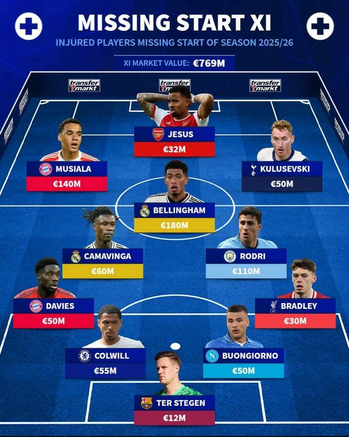 Відомий портал Transfermarkt опублікував стартову одинадцятку з топ-гравців, які пропустять початок сезону 2025/26 через травми.