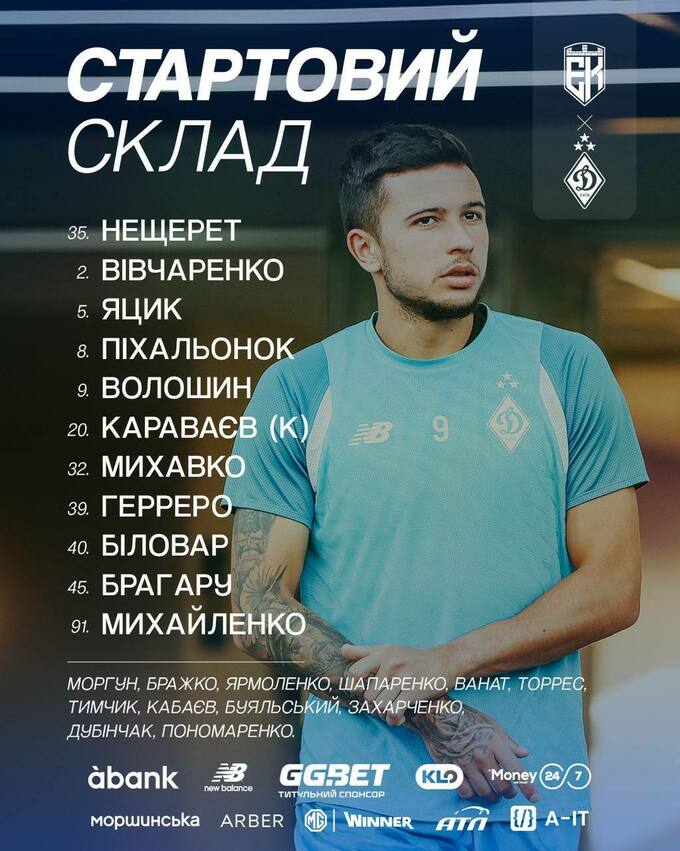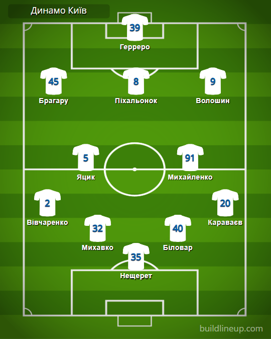 «Динамо» Київ: Нещерет – Вівчаренко, Михавко, Біловар, Караваєв – Яцик (Шапаренко, 67), Михайленко (Буяльський, 87) – Брагару (Торрес, 46), Піхальонок (Бражко, 67), Волошин – Герреро (Ванат, 72).