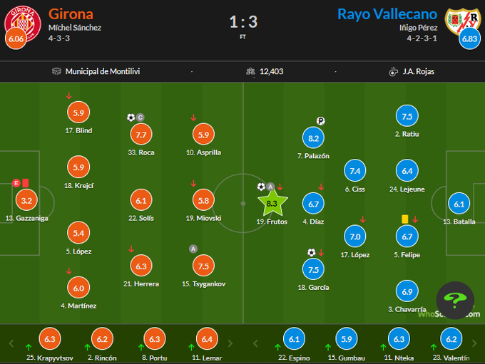 Оцінки WhoScored за матч Жирона – Райо Вальєкано (1:3)