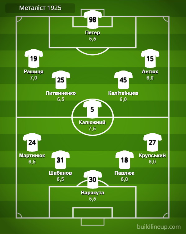 «Металіст 1925»: Варакута – Мартинюк, Шабанов, Павлюк, Крупський – Литвиненко (Чурко, 89), Калюжний, Калітвінцев (Панченко, 80) – Рашиця (Когут, 80), Петер (Мба, 60), Антюх (Гаджиєв, 89).