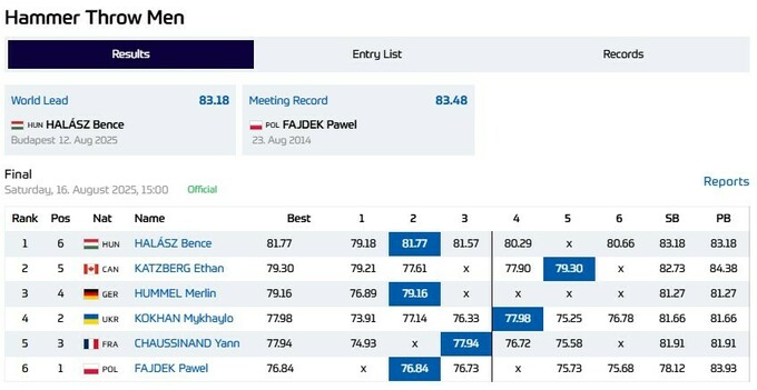 - 1. Бенце Халас (Угорщина) – 81.77 м