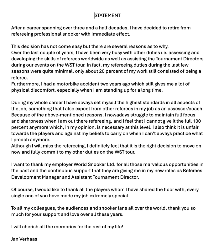 Знаменитий нідерландський снукерний суддя Ян Верхас повідомив про рішення завершити кар'єру: