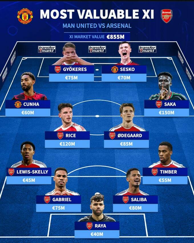Відомий портал Transfermarkt, з приводу матчу АПЛ між командами «Манчестер Юнайтед» та «Арсенал, опублікував найдорожчу стартову одинадцятку гравців цих клубів на сезон 2025/26.