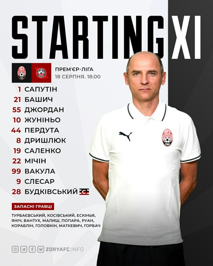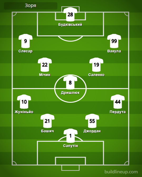 «Зоря»: Сапутін – Жуніньйо, Башич, Джордан, Пердута – Мічин, Дришлюк, Саленко (Руан, 63) – Слесар (Горбач, 81), Будківський, Вакула (Маткевич, 63).