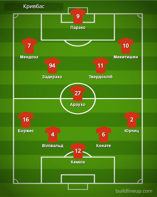 «Кривбас»: Кемкін – Боржес, Вілівальд, Конате, Юрчец – Задерака, Араухо (Шевченко, 46), Твердохліб – Мендоза, Парако (Каменський, 77), Микитишин (Лін, 77).
